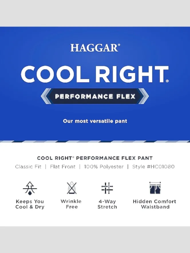 Cool Right® Performance Flex pants are Haggar’s most versatile slacks. They can take you straight from the office to the golf course. Wrinkle-free, they help you look your best in any situation. These slacks feature Cool Right® technology which moves moisture away from your body to keep you cool and dry.