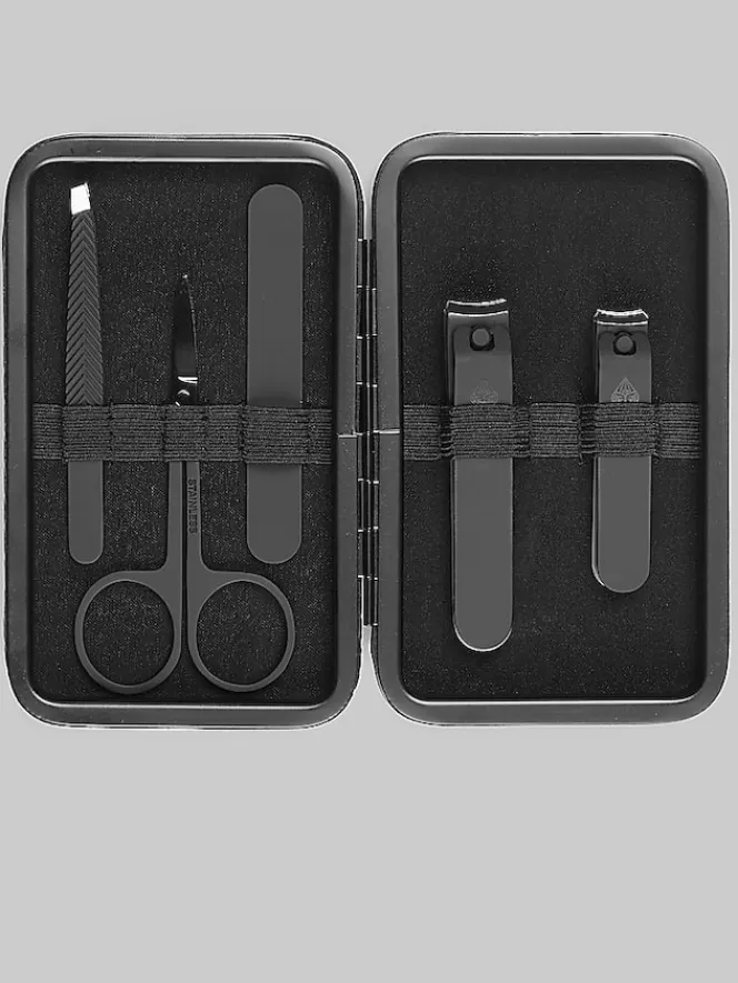 This high-quality, five-piece nail grooming kit includes precision stainless steel tools: nail clippers, toenail clippers, cuticle scissors, a nail file, and tweezers. The ergonomic design provides comfortable handling, and the materials are built for durability and hygiene. The compact size and streamlined design make it ideal for travel or everyday use. The kit comes with a vegan leather case for convenient storage.