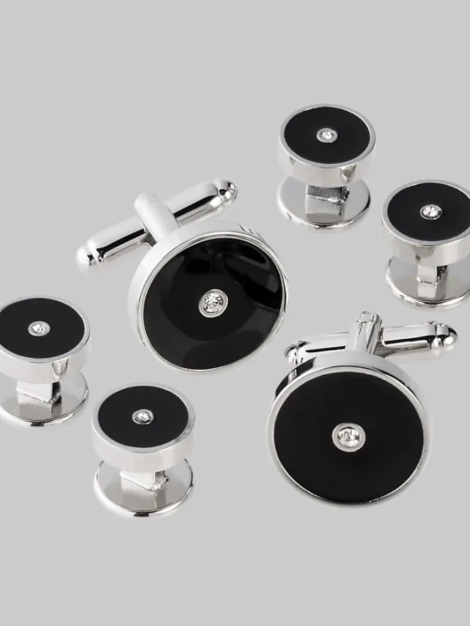 Because why should your suit have all the fun? This cufflinks and studs set is your formalwear’s secret weapon—sleek sterling silver, bold black enamel, and poppin’ single rhinestones that’ll catch every glance (and maybe a few envious stares). The bullet-back closure keeps them secure while you’re out there owning the room. Perfect for weddings, galas, or any occasion where “dapper” is the dress code. These aren’t just accessories; they’re confidence boosters in sterling silver disguise. Go ahead, make your tux proud.