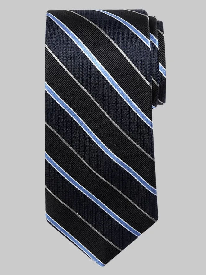 Elevate your look with a captivating interplay of pattern and dimension. Imagine a luxurious silk tie where stripes come alive with a variety of textures. Despite its textural intrigue, this accessory remains versatile. Pair it with a solid shirt for balance or let it be the star with a patterned shirt in complementary colors. Perfect for formal occasions, business casual, or dressed-up weekend looks.