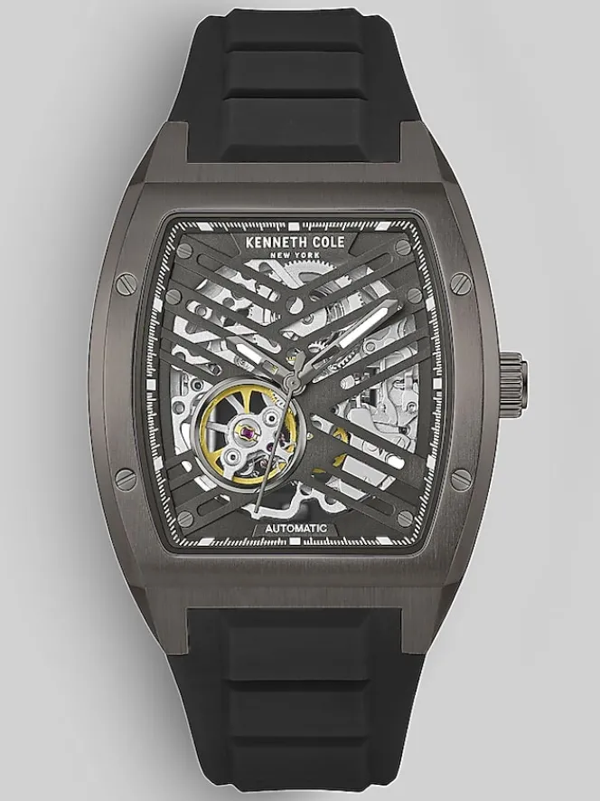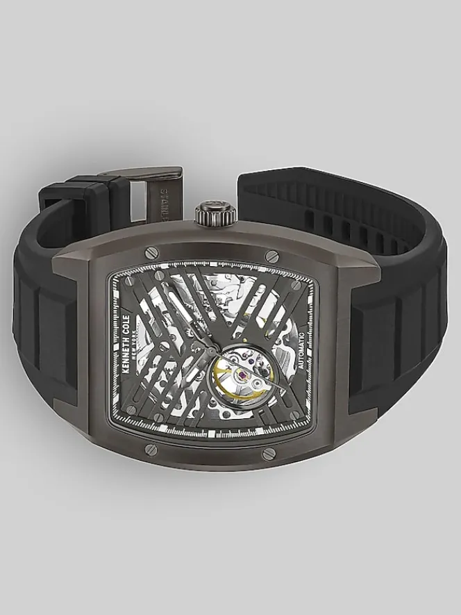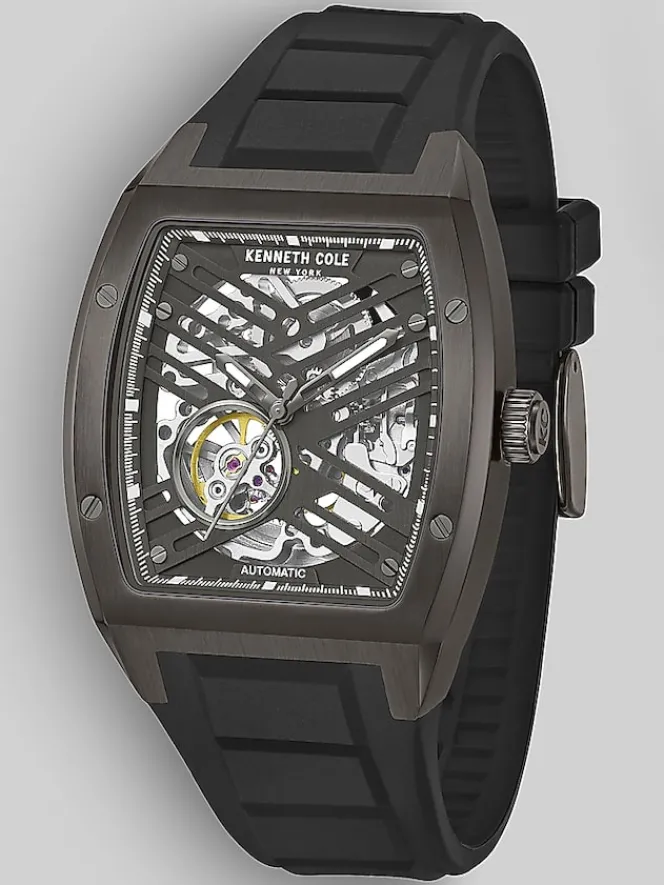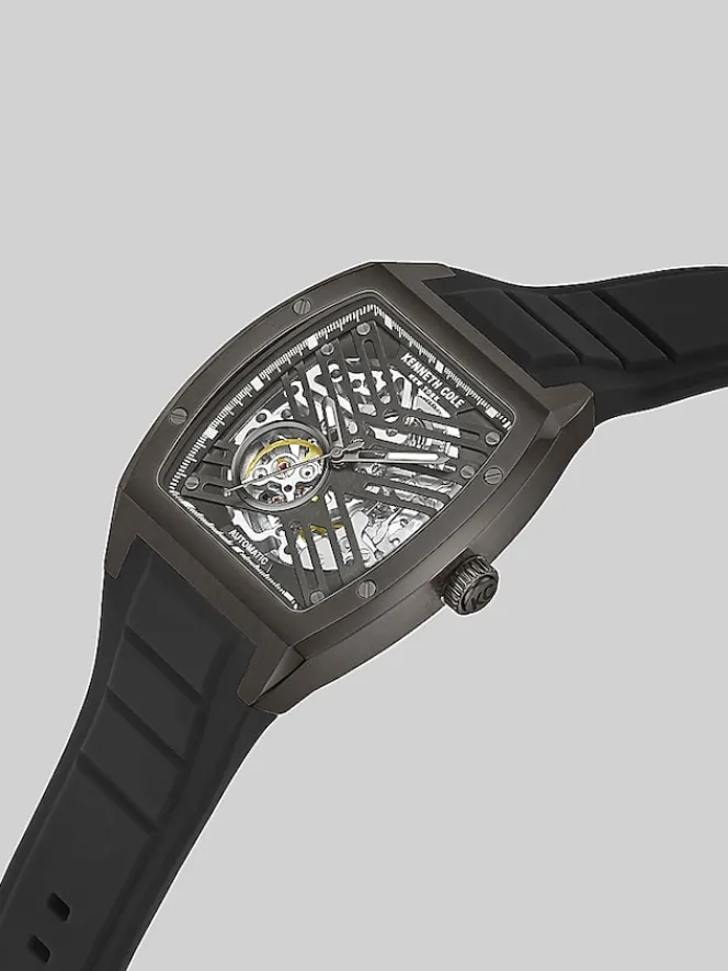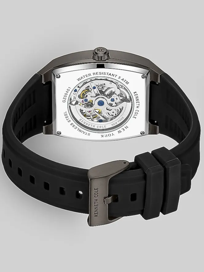 The Kenneth Cole New York Automatic Silicone Strap Watch is a handsome and sophisticated timepiece. Its brown-tone stainless steel rectangular case, accented with a gunmetal-tone dial, exudes a modern and minimalist aesthetic. The hour, minute, and second hands, have a gunmetal finish and complement the dial’s understated style. With 3ATM water resistance, it can more than withstand everyday splashes. The adjustable and flexible black silicone bracelet strap ensures comfortable wear, while the self-winding mechanism eliminates the need for battery changes. Crafted with precision, this timepiece is a testament to Kenneth Cole’s commitment to style and function.