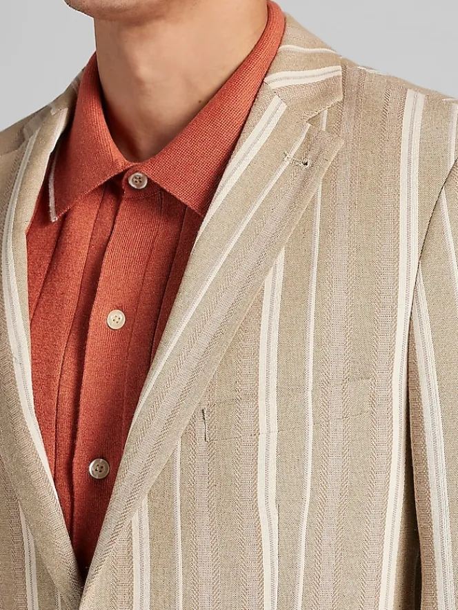 Stripes that mean business (and fun). This slim-fit suit jacket steps up your wardrobe game with a breezy linen blend that keeps you looking sharp and feeling cool. Perfectly tailored to create a streamlined silhouette, this jacket features a notched collar and single-breasted closure that means you’re always ready for that homecoming party or casual workday chic. Lightweight for comfort and styled in versatile neutral stripes, it’s your go-to piece to say, “I’ve got style, but I’m not trying too hard”. Pair it with matching pants or elevate your favorite chinos.
